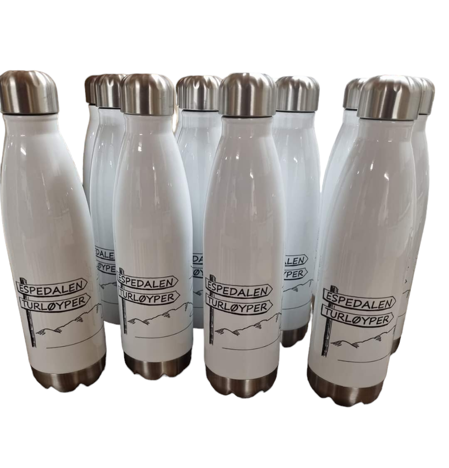 Flaske i metall med trykk i fullfarge. Flasken holder på både varme og kalde drikker.